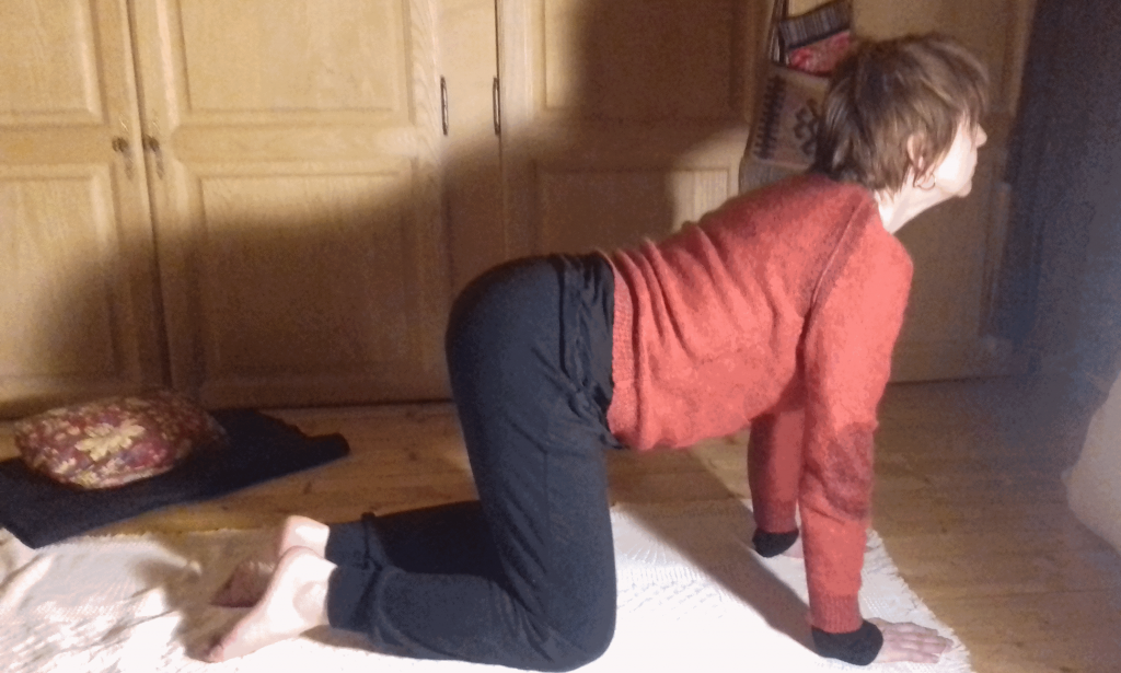 Mariasana et autres variantes. C’est-à-dire le chat, la souris, le tigre (chakrasana). Pour mariasana, se mettre dans la position d’un quadrupède, les jambes, genoux, pieds un peu écartés (écart bassin), les mains à l’aplomb des épaules, les bras tendus. Il faut se sentir bien campés, bien stables. À l’inspiration, on creuse le coccyx, le sacrum, les lombaires puis tout le dos, jusque dans la nuque. Lorsqu’on a un peu d’expérience, on peut suspendre le souffle, faire une rétention à plein (kumbaka) sans forcer bien sûr pour que cela reste fluide. À l’expiration, on va enrouler le bas du dos, coccyx, sacrum, lombaires et surtout pousser entre les omoplates. On fait le dos rond comme le chat. On pousse également le ventre vers la colonne. Même chose si l’on peut, on reste un moment dans une rétention à vide (kumbaka). Et puis cela continue, au fur et à mesure, on sent le mouvement de déployer davantage, le dos est de plus en plus mobile, et dans cet aller et venir, il y a quelque chose qui circule. On ressent beaucoup de plaisir dans cette pratique. On peut effectuer mariasana une dizaine de fois en se mettant bien dans sa respiration.