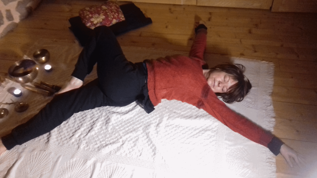 On écoute en savasana son corps, les points de contact avec le sol, le chaud, le froid, les tensions s’il y en a. On dit que cette posture permet de faire l’expérience de la mort. J’y reviendrai plus tard. On fait quelques respirations puis, on retourne la paume des mains et on fait glisser sur le sol les mains et les bras à la hauteur des épaules. On a ainsi, le corps en croix ! On pose le talon du pied droit sur les orteils du pied gauche. On inspire et sur l’expiration, on tourne les deux pieds vers la gauche, la tête (doucement !) à droite. Pendant toute cette série de torsions couchées, les épaules et les omoplates restent au sol. On respire dans la roue du cœur, anahata, la couleur verte, on ferme les yeux et on s’installe. Puis on revient dans l’axe, et on tourne, cette fois, les pieds vers la droite, la tête à gauche.