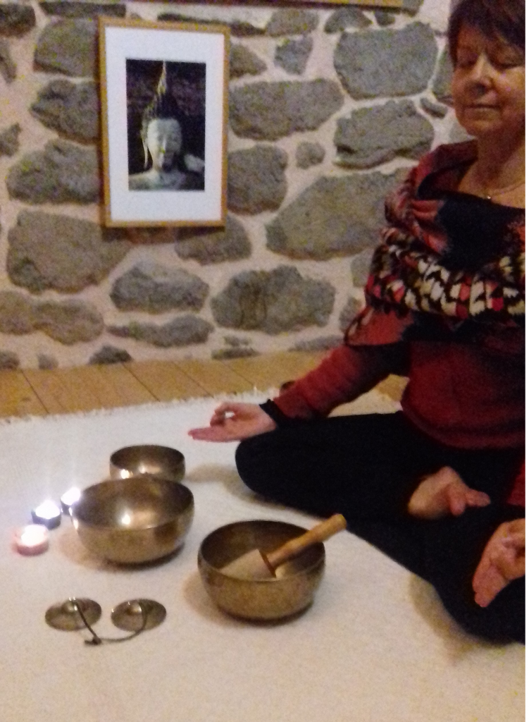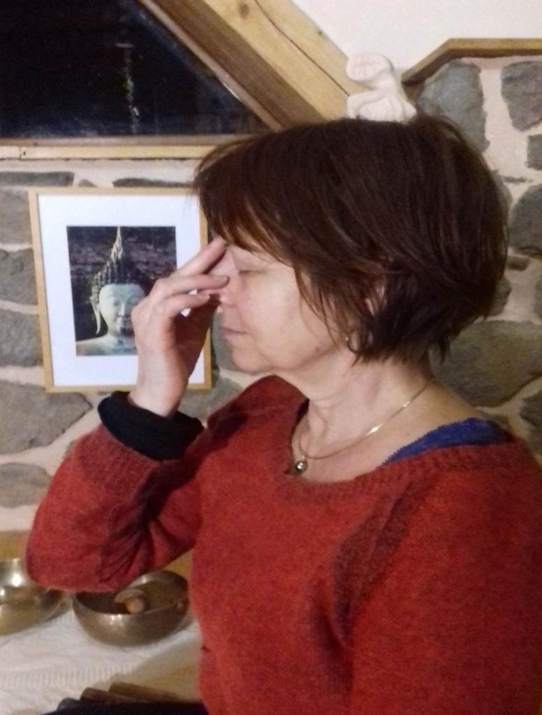 On s’attarde dans la fin de l’inspiration, dans l’expansion, l’ouverture puis aussi doucement que l’on a inspiré, on laisse le ventre redescendre, la main accompagne, les côtes se referment avec les mains et enfin les clavicules s’abaissent. Dans ce retrait du souffle, on le sent s’écouler jusqu’en bas. Tout se rassemble et se condense, tout au fond et puis ça repart…On peut faire ce pranayama cinq fois, lentement, profondément. Puis, ensuite on laisse faire la respiration, on ne la dirige plus et on accueille ce qui se passe. On n’a parfois que la respiration s’est ensuite absentée…On peut effectuer ce pranayama, assis ou allongé. Pour nadischodana (la respiration alternée) on est assis. On va sentir sa respiration aller et venir dans l’axe, le canal central que l’on nomme la shuchuna. On sent sa base sur le sol, sa colonne s’étirer, on laisse descendre les épaules mais la tête est dégagée vers le haut, le menton légèrement rentré.