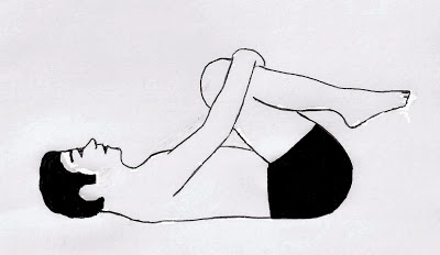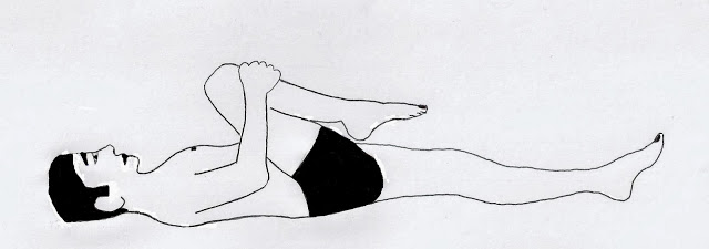 On poursuit ensuite, toujours allongé avec ardha pavana muktasana et pavana Muktasana.  Pavana signifie en sanskrit, ce qui purifie et mukta, ce qui libère.