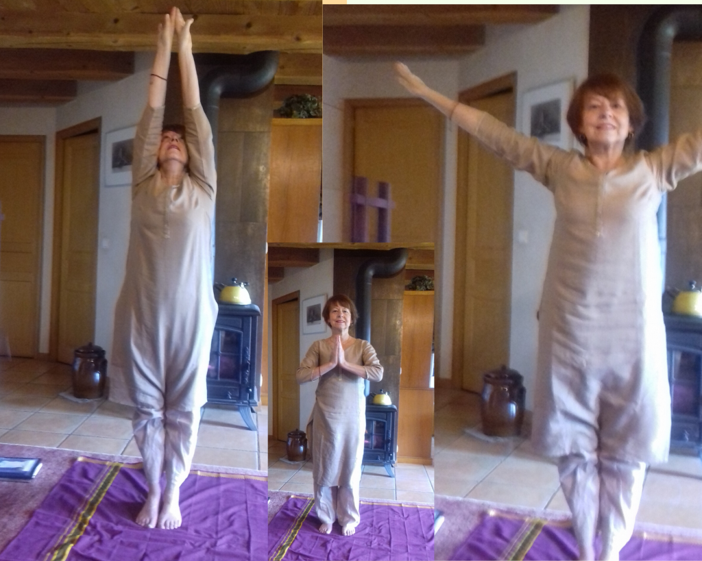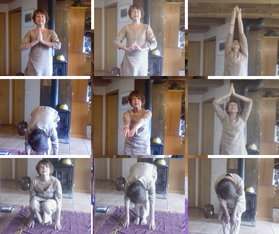 On débute donc debout, les pieds joints, les épaules descendues, l’arrière de la tête étiré vers le haut, la nuque est étirée également, les mains sont en Anjali mudra. On se met dans ses pieds, on sent les appuis, la terre et on sent également le lien avec le haut, le ciel. Entre terre et ciel. A l’inspir, le dos des mains est joint, on les fait descendre et remonter devant soi avec les bras. Les bras et les mains sont au dessus de la tête, les dos des mains en contact. On s’étire, puis on joint les mains au dessus de la tête, (à l’expir) on plie les bras et on fait descendre les mains devant le corps en enroulant en même temps le dos. On continue de se baisser et le bassin va vers l’avant. On pose les doigts des mains sur le sol, bien ancrés, bien en appui. Puis, à l’inspir, appuyé sur les mains et dans ses pieds, on va fléchir les jambes, se mettre en appui sur les orteils et venir s’asseoir sur les orteils, les talons vers le haut. Le dos est en extension, on regarde vers le haut. Puis doucement, à l’inspir, en s’appuyant sur les mains et les orteils, on va remonter doucement, les mains et les bras devant le buste et reposer les talons au sol. Les mains et les bras remontent (à l’inspir), puis elles sont au dessus de la tête, dos des mains collé. Enfin, en expirant, les mains et les bras vont s’ouvrir très largement, se remettre de chaque côté du corps et retrouver Anjali mudra. Il est important de s’installer dans cette pratique, en sentant au fur et à mesure les corps s’étirer, se dérouler. Faire cet enchaînement au moins trois fois.