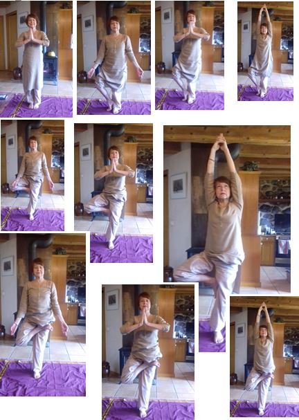 Puis postures d’ancrage : Vrikshasana. ( photos ci-dessous) l’arbre. C’est à la fois une posture d’ancrage, d’équilibre, de calme mental et de stabilité du souffle. Pour pouvoir rester dans la posture, il faut détendre et pour détendre, allonger les souffles, les rendre fluides et harmonieux. Debout, on peut se mettre également près d’un mur, la jambe gauche est tendue. On va poser le pied gauche soit en contact avec la cheville, soit du genou soit encore le plus haut possible sur la cuisse, en contact avec l’aine. Les mains sont jointes au niveau de l’espace du cœur, le regard devant fixant un point à l’horizon. On met en place une respiration lente. On va détendre les orteils, et on va détendre les muscles du visage. On visualise le souffle dans la roue du cœur, le chakra du cœur anahata.