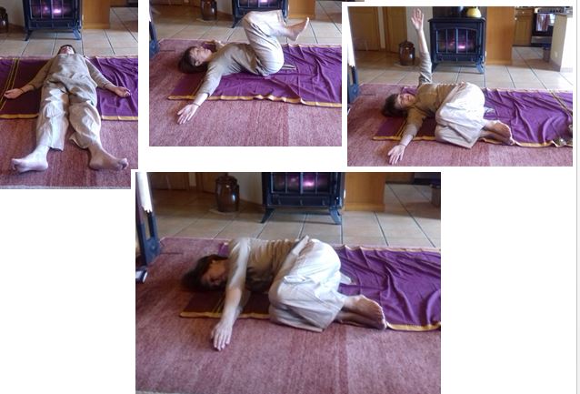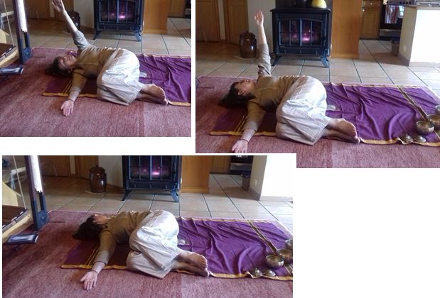Et torsion couchée (photos) Cette torsion va éliminer les toxines, stimuler la colonne vertébrale et la circulation avec un essorage très fort. On ressent à la fois cette énergisation mais également une grande détente, de l’équilibre entre note côté solaire et entre notre côté lunaire (la régulation des nadis, canaux d’énergie Ida, à gauche, Pingala, à droite). Pour faire cette pratique (Merci Sarah !). On est donc allongé. On va plier les deux jambes, les amener vers le buste, les bras sont à l’horizontal, les paumes des mains tournées vers le ciel. On positionne bien ses épaules en contact avec le sol. On va basculer les jambes pliées sur le sol à droite. On va lever le bras gauche à la verticale et venir poser la main gauche sur la main droite, ouverte. On arrondit son dos et on respire un moment dans le dos. Puis, on va lever le bras gauche à la verticale et suivre des yeux et avec la tête le mouvement du bras gauche qui va revenir se poser à gauche. La tête est tournée vers la gauche et les jambes sont posées sur le sol à droite. On s’installe et on respire dans le chakra du cœur, on visualise la couleur verte. On détend et on savoure ! On peut rester longtemps dans cette pratique. Puis on ramène les jambes, on retrouve l’alignement du corps. On accueille quelques instants comment ça circule. Puis on fait la posture de l’autre côté.