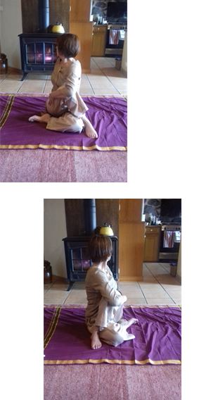 On poursuit en revenant au sol avec une assise, puis avec Kapalabathi (c’est un pranayama très puissant. Ce mot sanskrit signifie « faire briller le crâne ». Il permet de dégager les voies respiratoires, de nettoyer le mental. C’est une succession d’expirations très puissantes que l’on obtient en contractant le creux de l’estomac. Les inspirations sont passives. Les yeux sont fermés et le regard se porte vers le haut, la shambavi mudra (le geste du bonheur que l’on situe au niveau de la fontanelle). On peut prononcer durant la pratique le son Om qui résonne à chaque fois que l’on expire.