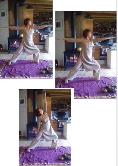 Virabadrasana (deux postures du guerrier) photos. On ressent dans ces deux postures, cette ancrage dans le sol, dans la terre et cette grande stabilité et c’est parce que c’est solide en bas que l’on peut ouvrir en haut, partir au « combat ». Ces postures incarnent la persévérance, le courage. Elles renforcent les appuis, les jambes et l’ouverture du cœur. On respire dans la roue du cœur, anahatha. Pour prendre la posture, les mains sont jointes devant l’espace du coeur. Puis on va écarter les jambes. On va ouvrir le pied gauche et rentrer un peu le pied droit, puis une fois encore on ouvre le pied gauche. On sent alors le bassin se tourner vers la gauche. On va tourner la tête également. Tout le corps est dans l’alignement de la jambe gauche et du bras gauche. La tête est dégagée des épaules. Sur une expir, on va descendre verticalement (non non on ne se penche pas), on descend dans ses pieds, dans ses appuis. Toute l’attitude du corps exprime ce courage, la persévérance. Rappelons qu’il s’agit d’un guerrier spirituel! On devient ce guerrier spirituel! On peut rester quelques respirations, pas trop pour ne pas se fatiguer car c’est puissant. Puis on va retourner la main gauche, paume de main vers le ciel. Le bras gauche également se tourne laissant montrer l’intérieur du coude. Puis on lève le bras gauche à la verticale. on suit du regard la main gauche située tout en haut et dans cette extension, on ouvre son coeur, et on vient poser la main droite sur la jambe droite. Le guerrier lève la garde, il présente son coeur. Quelle belle attitude, non ? On reste quelques instants toujours bien planté et on respire dans le chakra du coeur, anahata. On revient devant, on accueille et on fait la posture de l’autre côté, en appui cette fois sur le côté droit.