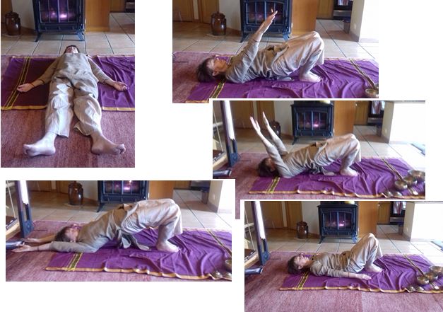 Ardha Setu bandhâsana (le demi-pont) (photos ci-dessous) : toujours allongé, on va ouvrir les jambes avec un écart bassin, puis les pilier et placer les pieds bien à plat le plus près possible des fessiers. A l’inspir, on monte les bras, on les place à l’arrière de la tête sur le sol et en même temps qu’on monte les bras on monte le dos, pour être en appui sur les épaules, puis on met en place mulabanda (contraction du périnée). On étire bien le dos, on s’attarde dans la fin de l’inspir (on savoure cet étirement du dos) puis à l’expir, on va redescendre les bras en même temps que l’on redescend le dos. On garde mulabanda jusqu’à la fin; quand les fesses et les bras sont revenus sur le sol, on enlève la contraction. On refait cette pratique 5 fois.