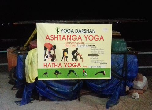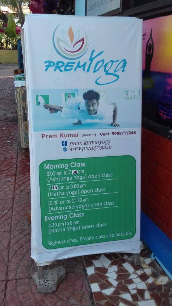 Le yoga est très présent à Kovalam souvent associé à une pachankarma c’est-à-dire une cure ayurvédique. En se promenant le long de la digue qui longe l’océan Indien et la plage, on peut voir un certain nombre de panneaux annonçant des cours de yoga et les horaires. Certaines affiches, toutes en anglais, aguichent le voyageur occidental en montrant le professeur dans des postures acrobatiques apparemment prisées. Sur d’autres on peut lire des slogans prometteurs. Les cours sont donnés par des indiens et aussi beaucoup d’occidentaux qui viennent avec leurs groupes ou qui vivent une partie de l’année à Kovalam. Il y a beaucoup de concurrence pour pouvoir dénicher une salle spacieuse et correcte. Le yoga est très en vogue! Au troisième étage donc du « Golden Sand », on domine Kovalam avec une vue sur les cocotiers, les palmiers, et, sur les jardins avec piscine des hôtels à proximité.