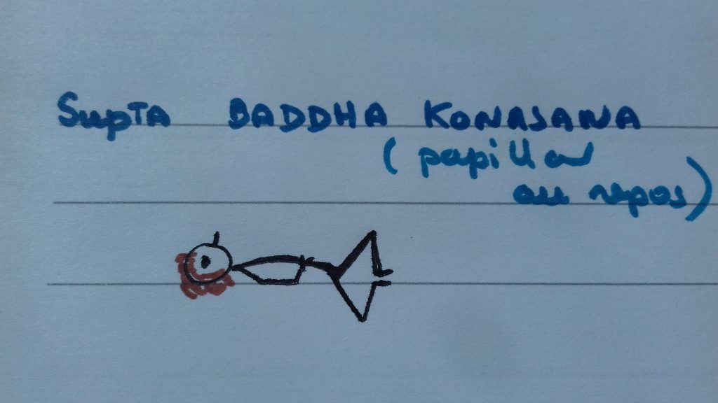 • Supta Baddha Konasana (le papillon au repos). Une posture très bénéfique pour l’ouverture des hanches et du bassin. On va chercher la force dans le ventre et on va ressentir le plancher pelvien.