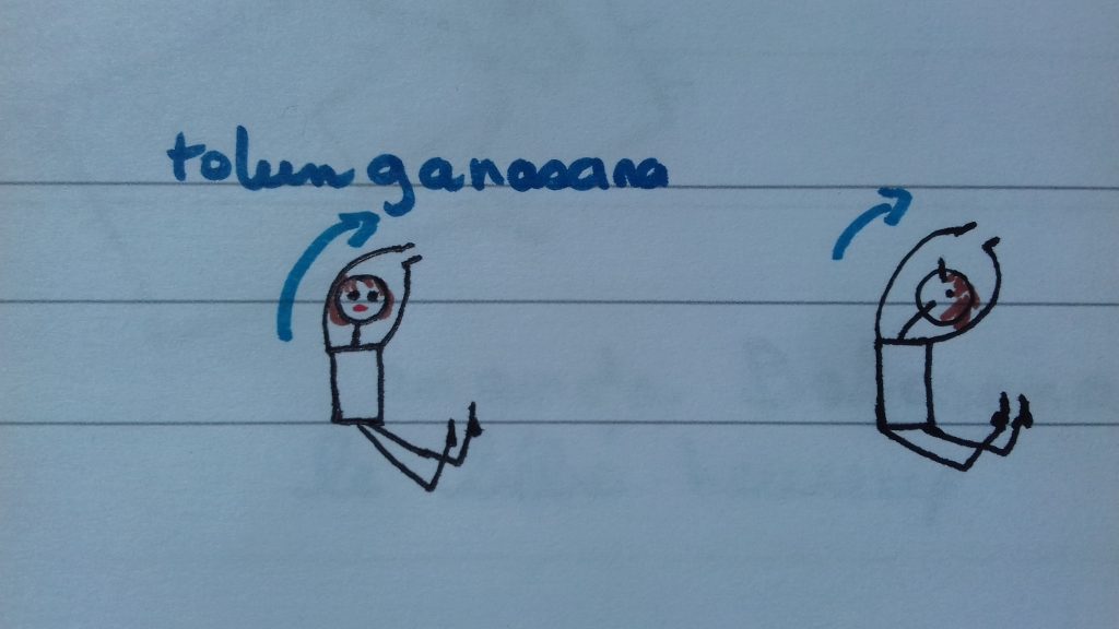 • Puis on va poursuivre avec Tolunganasana, le balancier. Cette posture nous permet d’étirer la charnière alternativement à gauche et à droite (ou inversement). C’est un étirement profond. Veiller à garder l’espace du coeur, le plexus solaire et tout l’avant du buste bien ouvert. Si la posture est inconfortable, on place un coussin sous les fesses. On reste 5 respirations de chaque côté. On accueille à nouveau en Vajrasana et on effectue la posture de l’autre côté.