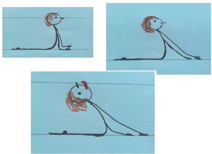 • On va maintenant se mettre sur le tapis à plat ventre pour aborder une grande posture dans le hatha yoga et particulièrement, le natha yoga en propose une version en trois phases tout à fait intéressante. Il s’agit de Bhujangasana, le cobra. Le natha yoga envisage cet asana comme une occasion de « développer sa puissance personnelle, la puissance intérieure principalement dans les moments où se sent en manque de ces qualités » (ma formation de professeure de yoga avec Philippe Marcoux). On dit aussi, que si on s’installe dans cette asana longtemps, cela peut réveiller l’énergie d’en bas endormie (la Kundalini). L’énergie va monter dans l’axe, on sent la chaleur, dans le bas du ventre, l’espace du coeur et dans les yeux. Sur le plan physique, elle stimule la colonne vertébrale et la moelle osseuse, le système immunitaire. « Cette posture développe l’endurance, la confiance en soi, l’énergie et la volonté, pour se recentrer, se stabiliser ». « Elle met à jour les contenus liés à la base, à l’inconscient, notre animalité ». On va libérer les énergies furieuses, agressives, violentes que nous pouvons avoir en nous. Cet asana nous propose de devenir le cobra; c’est une posture de mutation. On va disparaître en tant qu’humain et sentir que nous nous transformons en cobra : une énergie puissante, une énergie de vie mais qui peut aussi être une énergie empoisonnée. On est au niveau des mythes, des symboles et des analogies. Ainsi, nous mêmes nous avons de l’énergie formidable mais aussi des énergies qui nous entravent et « nous maintiennent dans l’ignorance ». Cet asana nous fait faire l’alchimie entre ces polarités, « de façon à ce que nos énergies dans l’ensemble soient des énergies de puissance personnelle et d’évolution ».