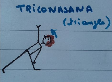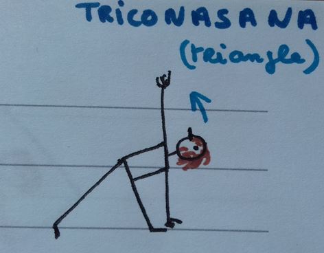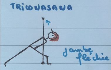 • Nous poursuivons avec Triconasana, le triangle. Deux sortes de triangle. Une posture de puissance, d’ouverture du coeur et sur le plan physique d’ouverture des hanches. On va sentir ses appuis se renforcer.