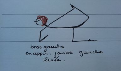 - On commence donc debout en prenant le temps de nous installer, sentir la pesanteur, le contact avec la terre, descendre les épaules, étirer la nuque, sentir sa verticalité : entre terre et ciel!