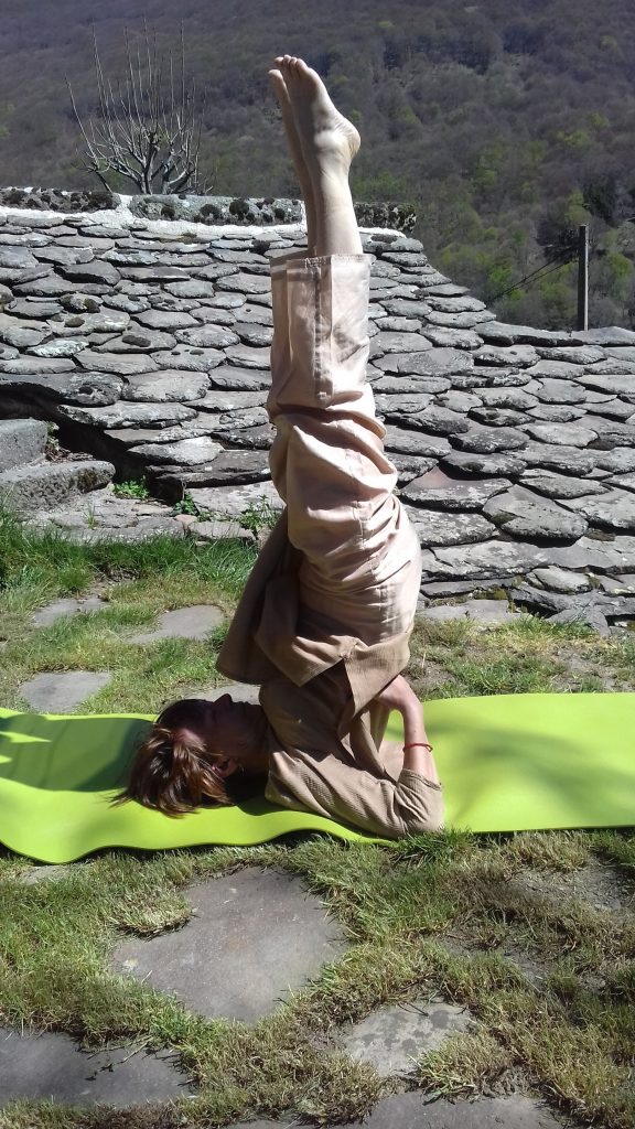 Enfin, on va faire Sarvangasana, la chandelle. C’est une grande pratique dans le hatha yoga. Elle nous invite à renverser le sens de la circulation sanguine notamment, et, irriguer fortement notre cerveau. Elle stimule la thyroïde. C’est sur le plan symbolique, une posture qui nous invite à un renversement de perspective, à du changement, à nous décaler, à sortir de nos habitudes. On peut l’aménager en se rapprochant d’un mur, le dos bien à plat, les bras et les mains légèrement ouverts, on va mettre les pieds au mur, les jambes à la verticale. Cela donne beaucoup de détente. On peut y rester un certain temps et mettre un petit coussin sous la tête ou dans la nuque..pour se sentir confortable.
