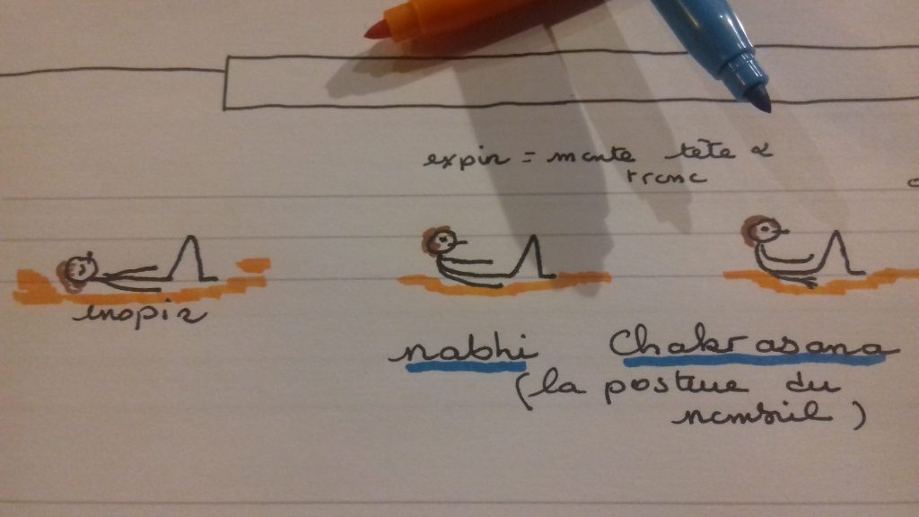 Nabhi chakrasana : on va plier les jambes, les pieds à plat. Les bras le long du corps. Les paumes des mains en contact avec le sol. On va inspirer et sur l’expir, lever la tête, les épaules, le tronc. Le bas du dos reste bien en contact avec le tapis. On va regarder le nombril. Si on a les yeux fermés, le regard intérieur se porte sur le nombril. Puis on va rester dans une rétention à vide kumbakha. On sent que ça chauffe au niveau du ventre. On va relâcher en inspirant. Puis on expire en reposant la tête, les épaules, le haut du dos. Puis on recommence, on inspire et en expirant on monte la tête, épaules, tronc. On reste dans la rétention à vide. On fait cette pratique plusieurs fois en prenant soin de bien détendre et relâcher entre chaque pratique. 3 à 5 fois. C’est assez puissant.