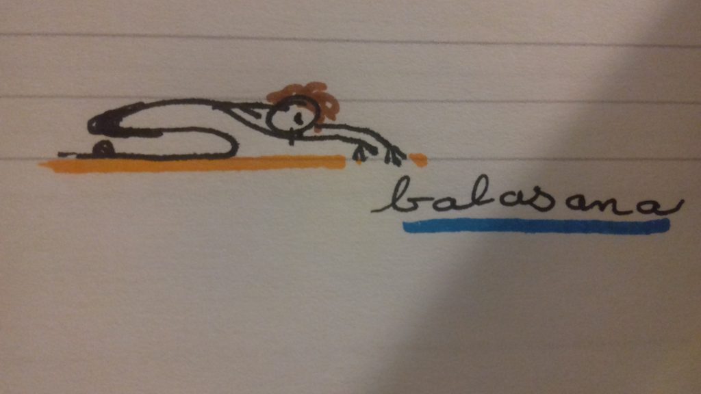 En appui sur les mains on va venir s’asseoir sur les talons, en Vajrasana, la posture du diamant. Puis on va s’installer en Balasana. Le front sur le sol. Les bras vont être tendus devant la tête un peu écartés, en appui sur la pulpe des doigts. On respire dans l’axe, la Sushumna.