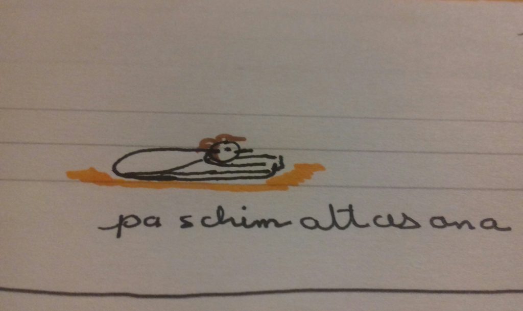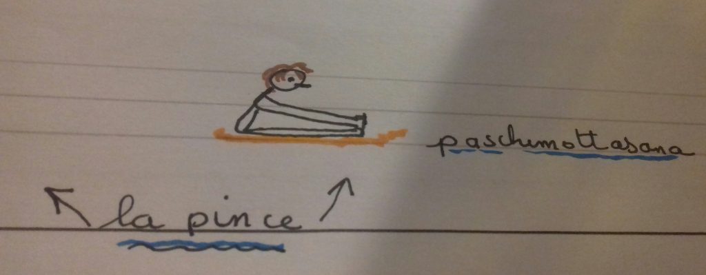 Puis Paschimattasana, une variante de la pince. On fait reposer le ventre sur les cuisses tout en étirant le dos vers le haut et vers les pieds. On peut aménager la posture, l’apprivoiser en pliant les jambes, pieds à plat mains derrière les pieds et on va faire avancer les pieds vers l’avant du corps, ou les faire glisser en maintenant le contact du ventre avec les cuisses et l’étirement du dos. On s’installe dans la posture et en respirant dans le dos. Ces deux pinces permettent d’étirer tout l’arrière du corps et aussi de stimuler le ventre.